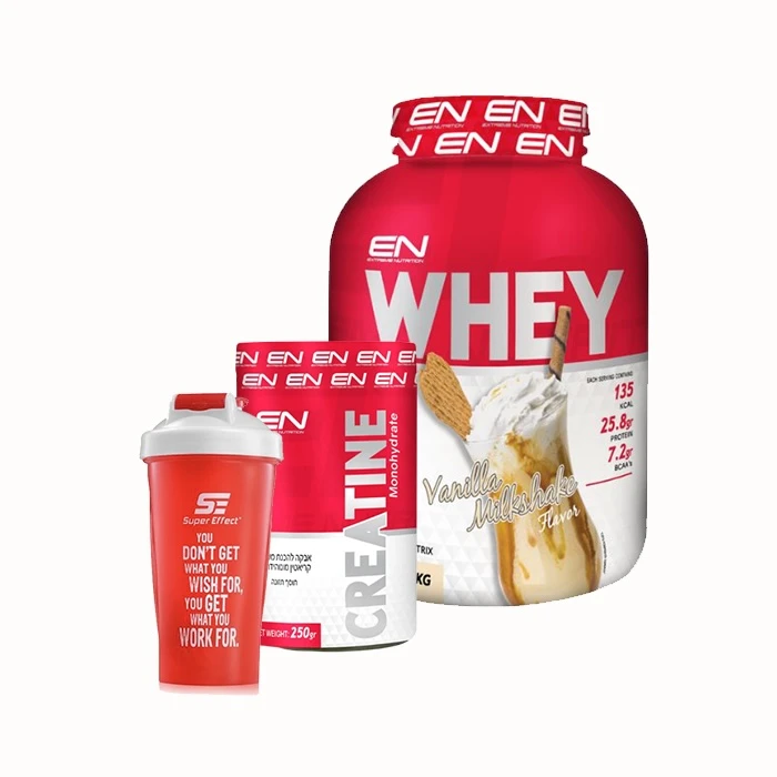 אבקת חלבון אקסטרים 2 ק״ג+קריאטין מונוהיידרט 250 גרם+שייקר קפיץ מקצועי