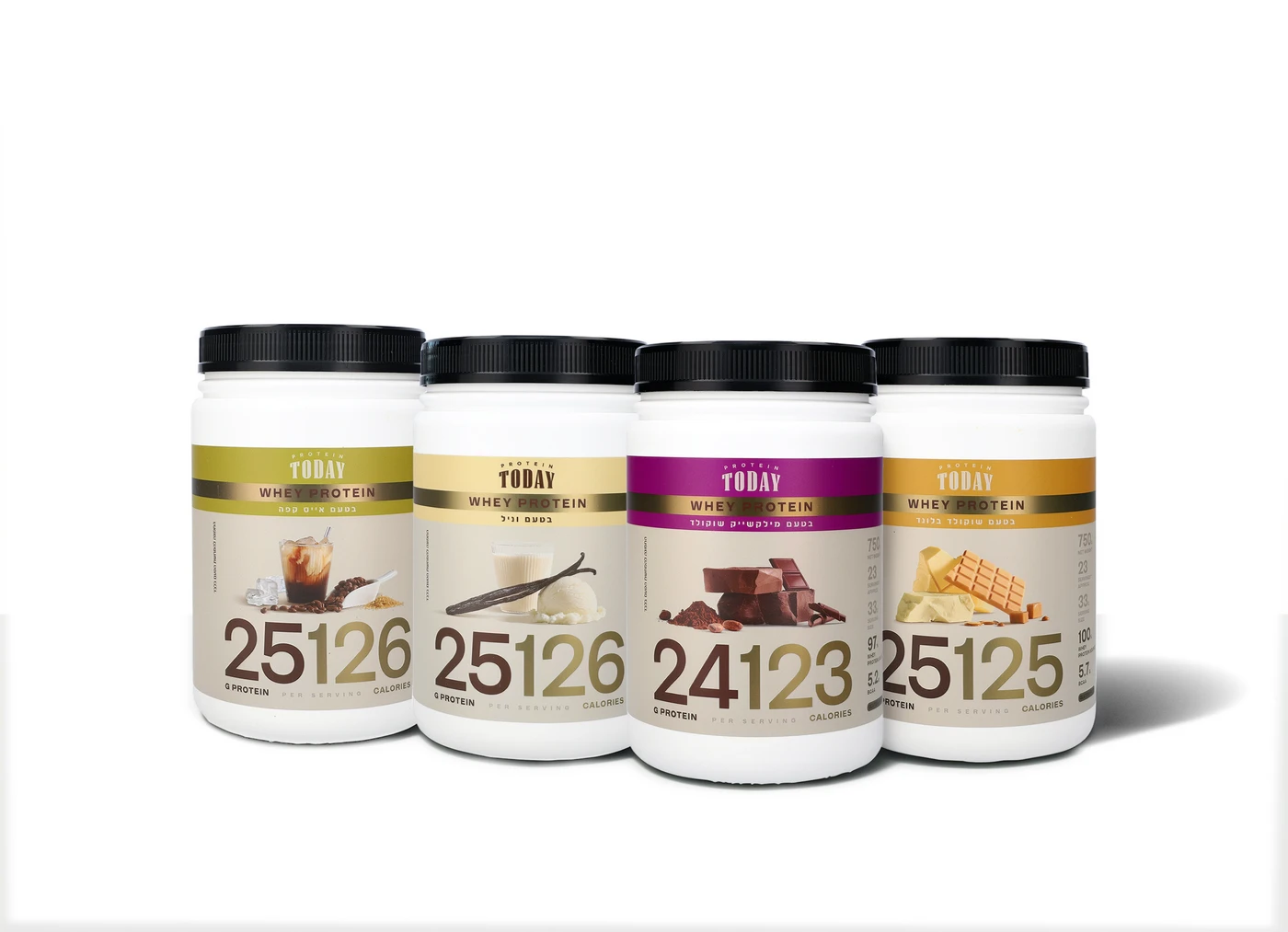 אבקת החלבון של חברת TODAY מכילה 25 גרם חלבון מי גבינה איכותי ורק 123-125 קלוריות.