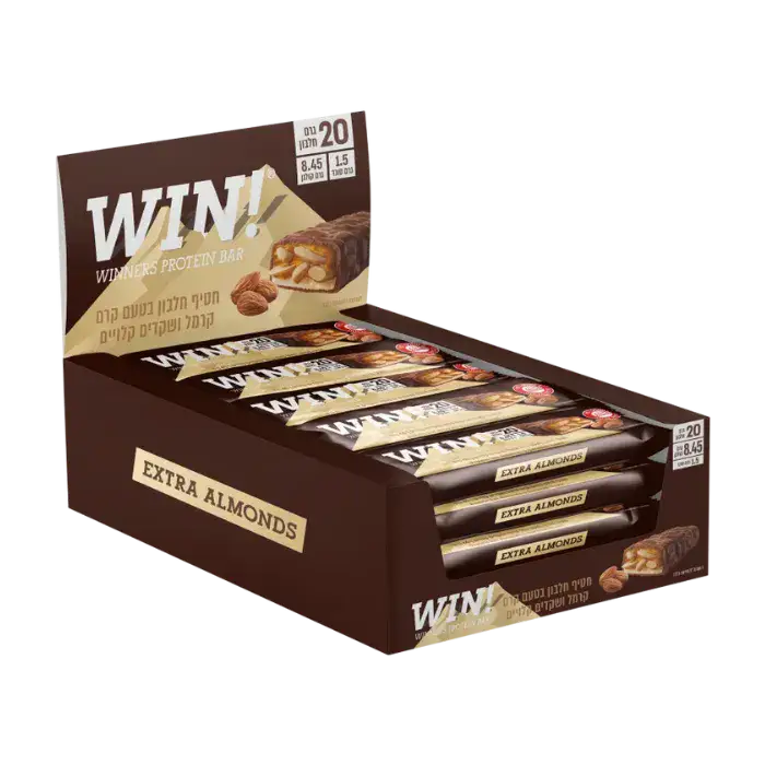 חטיף החלבון WIN בעל המרקם הרך והטעים, חטיף חלבון ווין עשיר בשקדים ובוטנים שנותנים פריכות לכל חטיף.